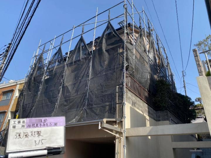 【足場架設工事】 この日は風が強かったので倒壊事故防止のため、メッシュシートは畳んで風が通る処置をしました |