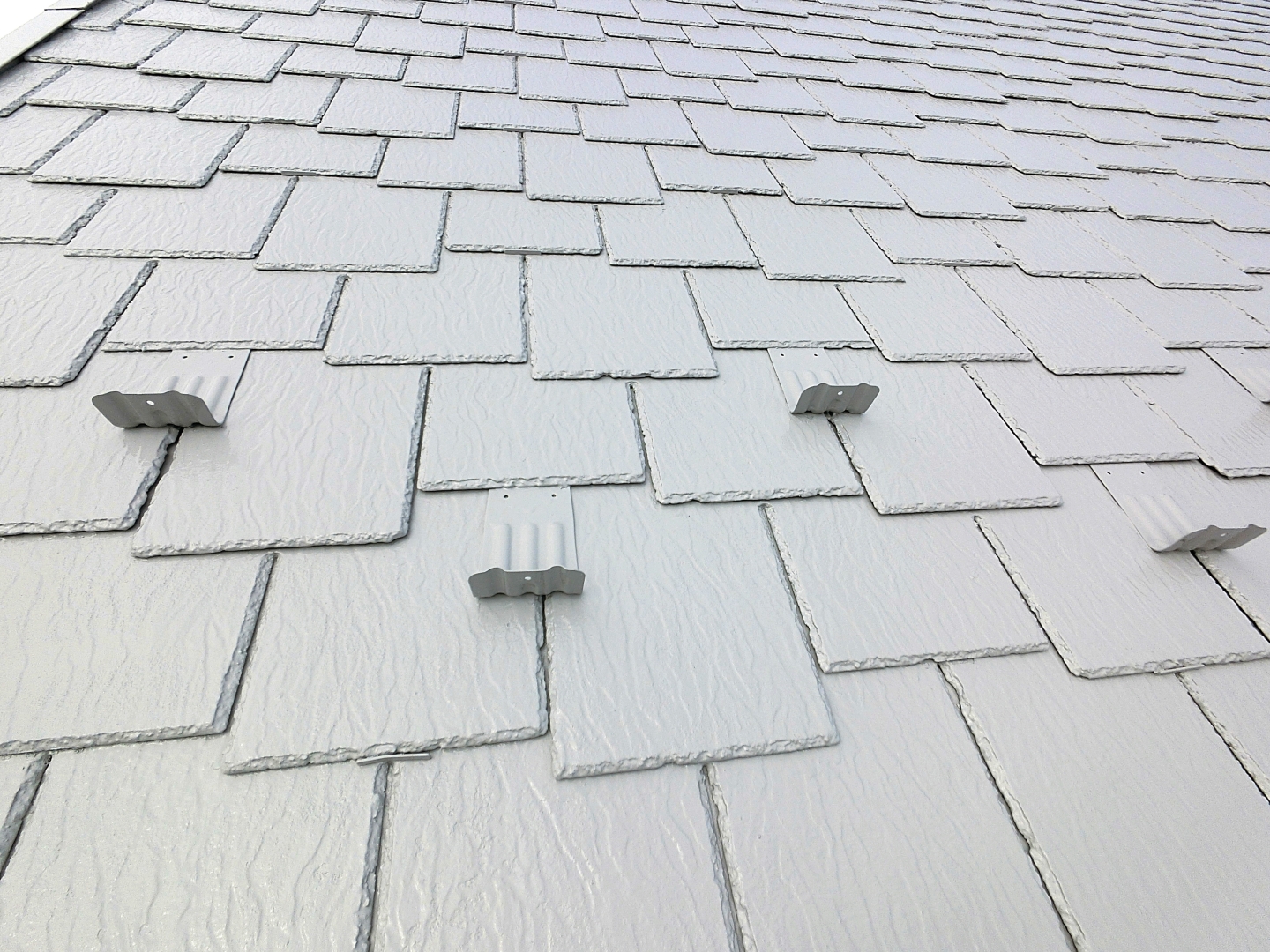 激しい色褪せと藻の発生が見られます。 タスペーサーの設置も無く、塗り替え時の塗装による屋根材同士の貼り付きも起きています