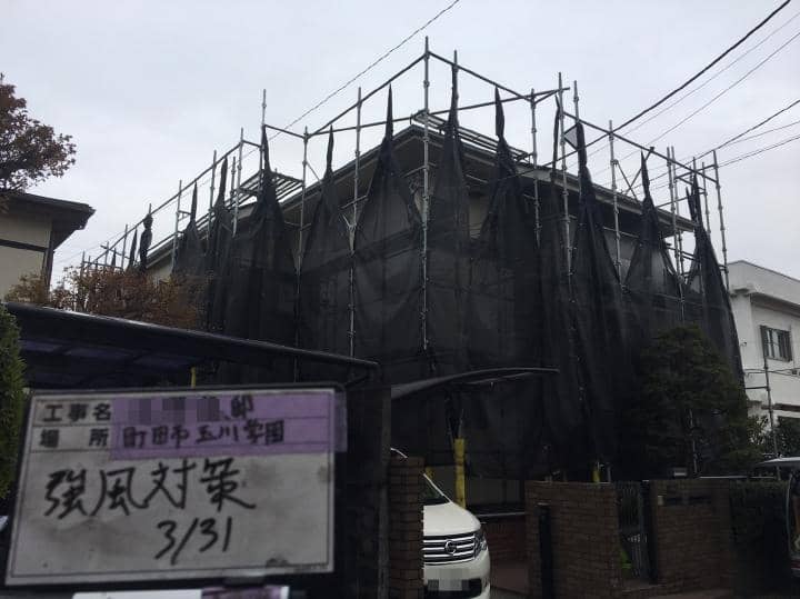 【足場架設工事】 気象庁からの強風注意報をうけ倒壊事故防止のため、メッシュシートは畳んで風が通る処置をしました |