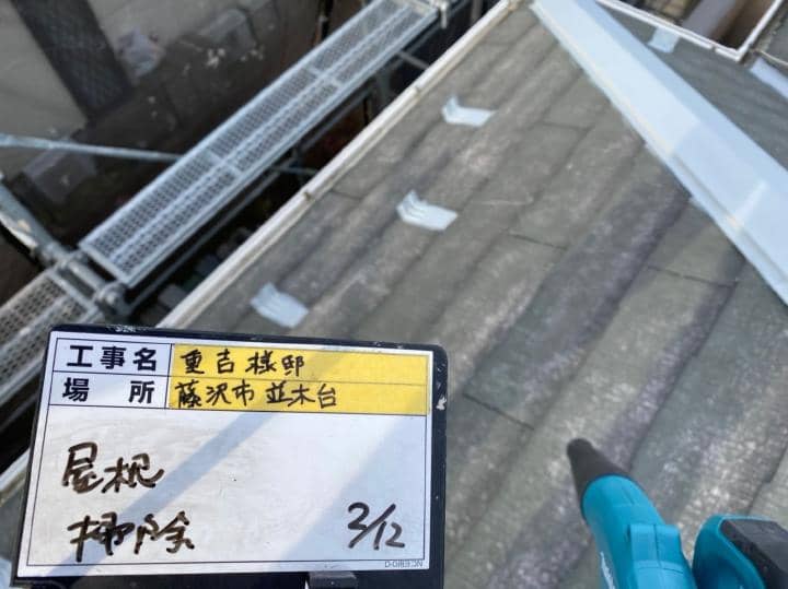 【屋根塗装】 高圧洗浄から時間が経って僅かですが”ホコリ”を被っているので塗装前にブロアーで清掃しておきます |