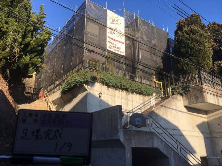 【足場架設工事】 定番となった黒いメッシュシートは足場に人が居ると透けて見えるため防犯性が高く大変ご好評をいただいています |