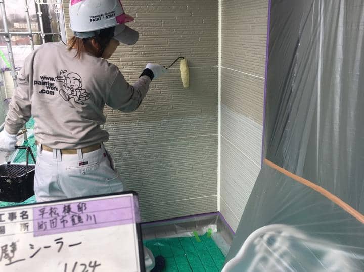 【外壁塗装】 外壁下塗り2回目では白い色をつけたシーラーで下塗りを施します 美しく仕上げるには下塗りが大事。 耐久性にも関わってきますので透けたりしないように均一に塗装します |