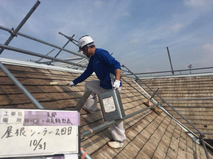 【屋根塗装】 傷みがひどく一度のシーラーは塗膜にならず吸い込まれてしまいました 再度シーラーを塗装して下地を強化します |