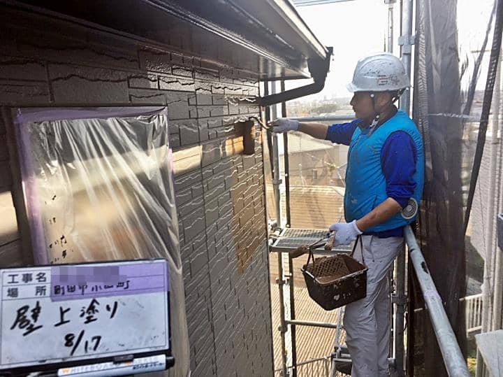 【外壁塗装】 上塗りは中塗りがしっかり乾いたら塗布量をしっかり確認しながら施工します |