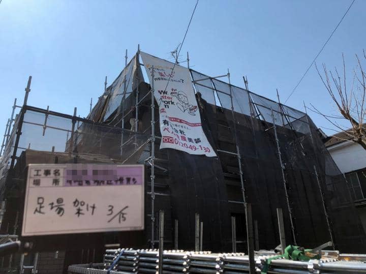 | 【足場架設工事】 定番となった黒いメッシュシートは足場に人が居ると透けて見えるため防犯性が高く大変ご好評をいただいています |