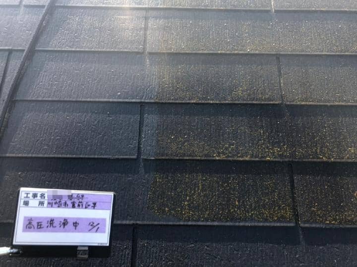 【高圧洗浄工事】 左から洗っています。 高圧洗浄で汚れや藻、そして付着の弱くなった塗膜ごと削ぎ取るように洗います |