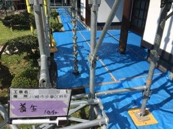 | 付帯物の軒天井の下塗りシーラーから塗装を行います | 工事が始まったばかりですが、ここで季節外れの台風が到来! 飛散防止ネットを下げて風の通りを妨げないようにして足場の倒壊事故を防ぎます |
