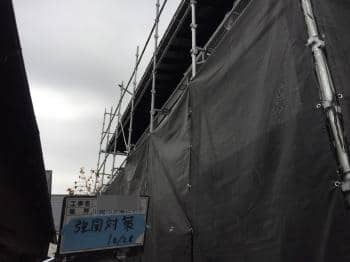 | 外壁のモルタルが崩れてしまっていた部分の補修が完了~ | またもや強風が! 再度飛散防止ネットを下げて風の通りを妨げないようにして足場の倒壊事故を防ぎます |