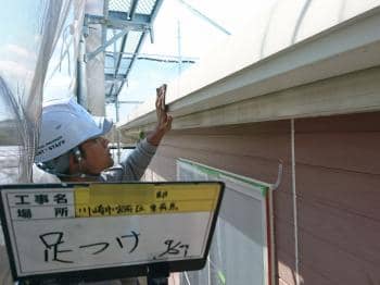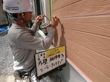 | 外壁サイディングへの下塗りシーラー塗装を行います | ボード同士の細い隙間を埋めたので、その部分にシーラーを塗布しています |