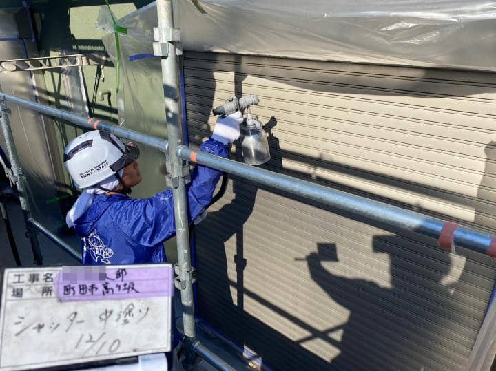 | 【付帯物塗装】 シャッターは余計な塗料がつかないように、また薄すぎる塗膜にならないように低圧温風機で塗装しています ※低圧温風機です。吹き付けなら何でも同じではありません |
